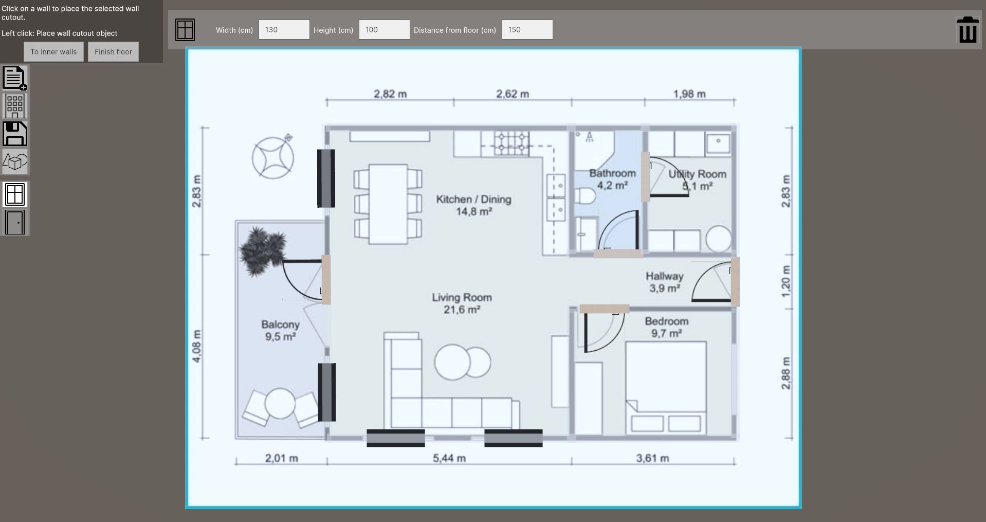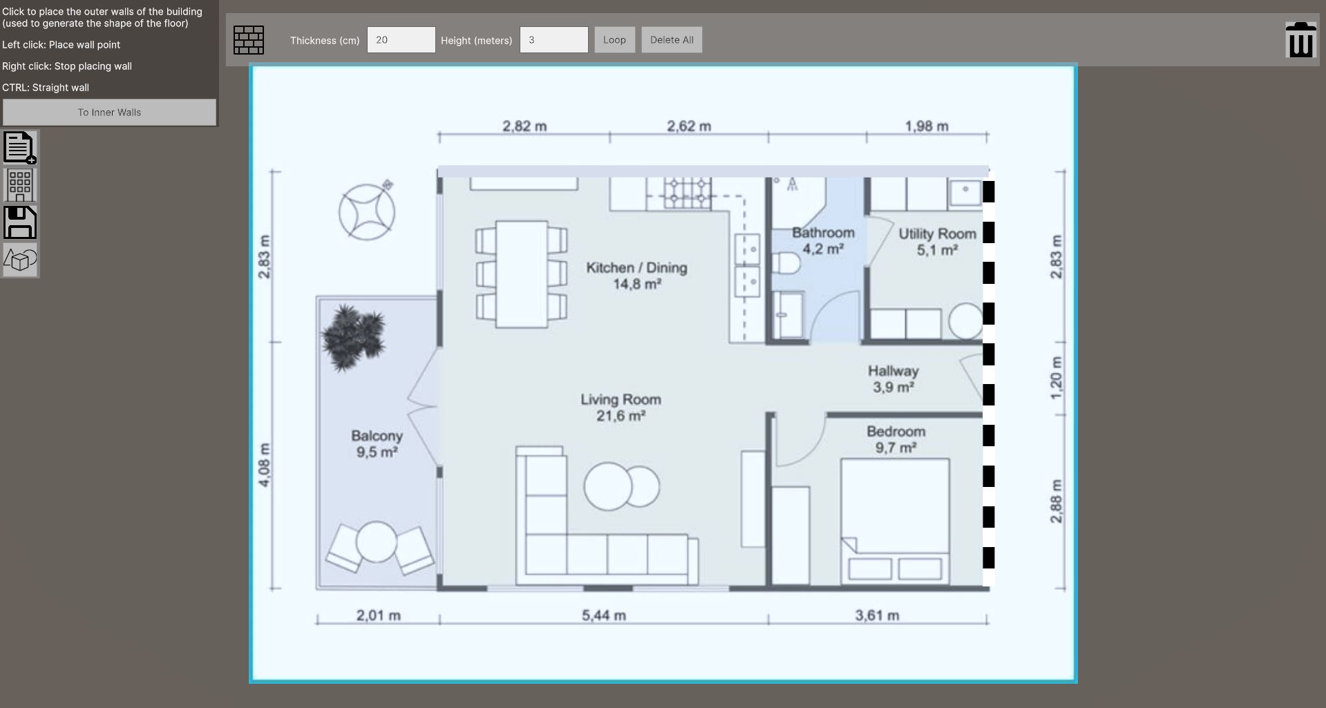 The tool has been made to be as user friendly as possible, since most of the target audience are not that comfortable using a computer. So, to place the wall points, windows, and doors, the user just needs to click on the blueprint. This will give immediate feedback, by either place the object, or a line representing the wall.