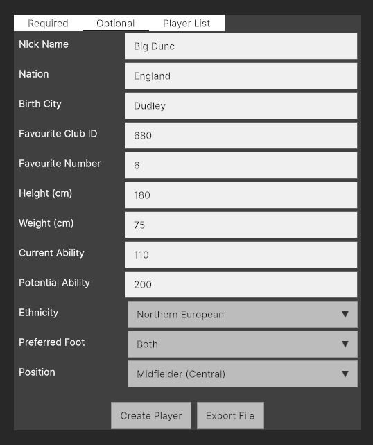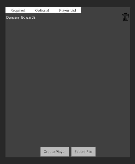 The first page holds the required properties. These properties are required to be filled in by the game in order to create a player. The second page holds the optional properties. These properties are not required to create a player and, if left blank, will be randomised by the game.